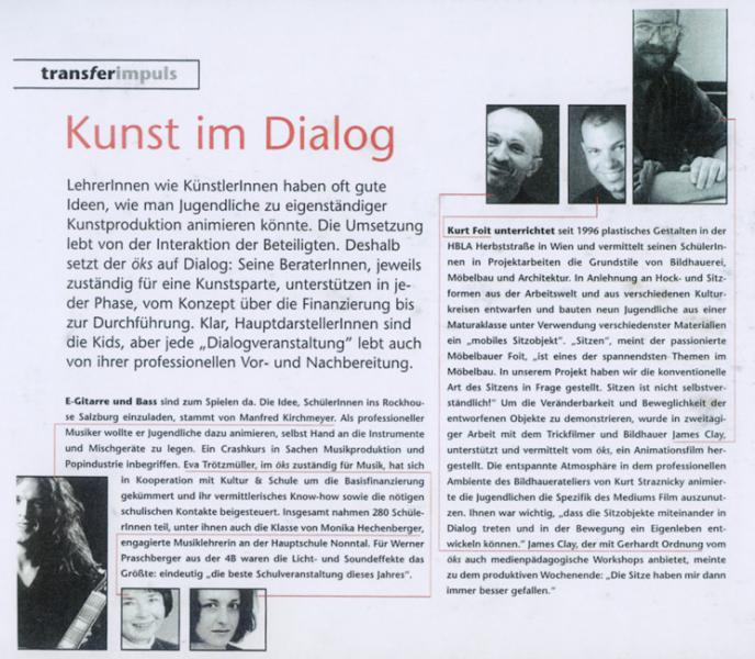 In Anlehnung an Hock- und Sitzformen aus der Arbeitswelt und aus verschiedenen Kulturkreisen entwarfen neun Jugendliche aus der Maturaklasse von Kurt Foit mobile Sitzobjekte. Mit dem Trickfilmer James Clay ist daraus ein Animationsfilm entstanden. (Artikel auf der Schul-Website).